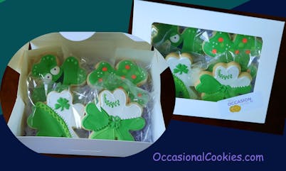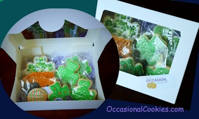 Your cookie box will include 2 large Shamrocks, Pot of Gold cookie, smaller nibbler shamrocks and rounds uniquely designed sugar cookies. Heat sealed and packaged for freshness.