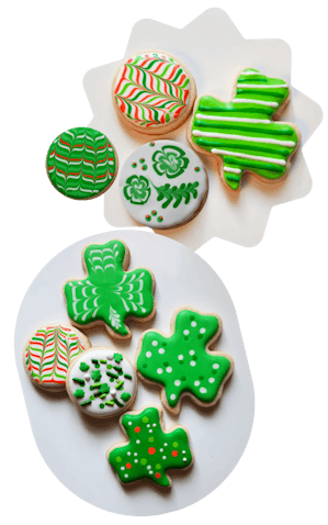 Color block shamrocks, St. Pat's Day theme cookies including Irish Eyes, Leprechaun, Pot of Gold, Irish sweater and much more. Cookies in this set are 3.5 inch - 4 inch in size.