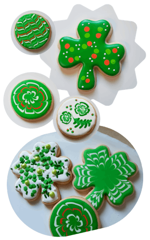 It's not just about the color green... my designs include the Irish tri colors. The technique is called ‘wet on wet’ when royal icing colors are applied as quickly as possible and creates some really different looks.
